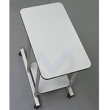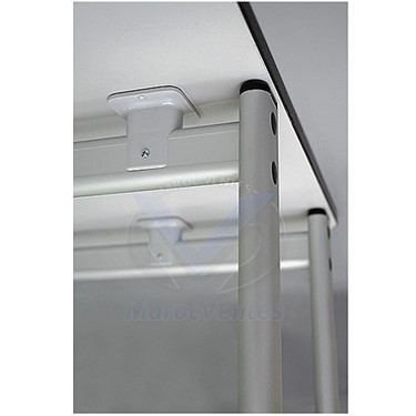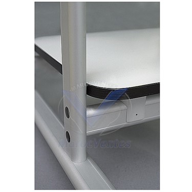 Table de projection universelleTable professionnelle multi-projection avec deux étagères pour le projecteur, l'ordinateur portable ou l'imprimante. Le dessus est en panneau de meuble de couleur grise. La base en aluminium argenté est mobile grâce aux roues verrouillables.