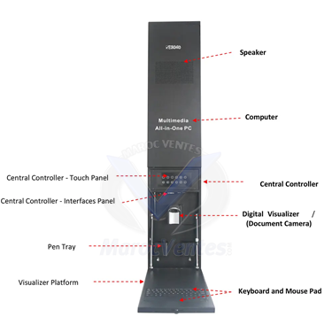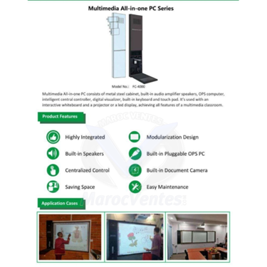 Le PC tout-en-un multimédia se compose d'une armoire en acier métallique, de haut-parleurs amplificateurs audio intégrés, d'un ordinateur OPS, d'un contrôleur central intelligent, d'un visualiseur numérique, d'un clavier intégré et d'un pavé tactile.Il est utilisé avec un tableau blanc interactif et un projecteur ou un écran LED, réalisant toutes les fonctionnalités d'une salle de classe multimédia.Description