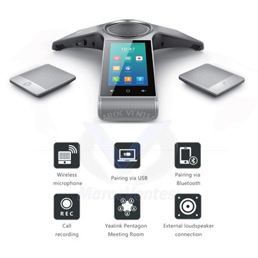 - 2 microphones sans fil CPW90 inclus- Écran couleur tactile 5" 720x1280- Android 5.1- Bluetooth 4.0- WiFi 802.11.b / g / n / ac- Menus interactifs à l'écran- HD Audio (haute définition)- Haut-parleur duplex intégral- Acquisition vocale jusqu'à 6 mètres et 360 °- Annulation des échos- Conférence à 5- Prend en charge l'enregistrement USB- Codec de voix : G722, G722.1C, G726, G729, G723, iLBC, Opus- Technologie anti-bruit Yealink- 1 compte SIP- Attente, muet, DND, enregistrement, hotline- Répétition du dernier numéro, appel en attente, appel d'urgence- Réglage manuel ou automatique de la date- Connecteur jack 3,5 mm pour haut-parleur externe ou amplificateur- Jusqu'à 1000 entrées / contacts- Journal d'appels- Importation d'annuaire- Portes et connexions- 1 RJ45 LAN 10/100- WiFi 2.4 - 5 GHz- Bluetooth 4.0- Port LAN Power over Ethernet 802.3af classe 4- 2 ports de microphone avec fil- 2 ports USB 2.0- 1 prise de sortie audio 3,5 mm- 1 port USB 2.0 Micro-B- 1 emplacement de sécurité- Dimensions : 338 x 338 x 74 mm - Plus d'images (7)